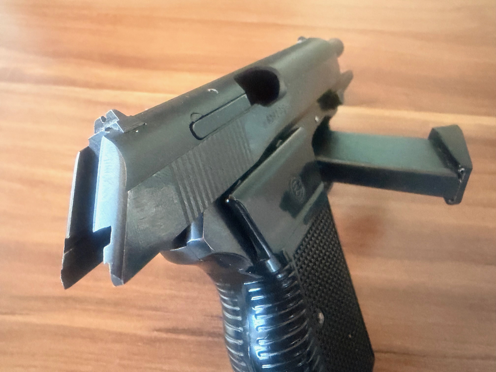 Die Waffe verfügt über eine starre Visierung, manuelle Sicherung und
