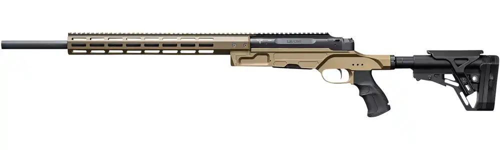 Die Waffe ist in klassischem Schwarz/Sand gehalten. Die HAENEL Repetierbüchse LR/ONE präsentiert sich mit einem ansprechenden und zugleich zweckmäßigen Design.